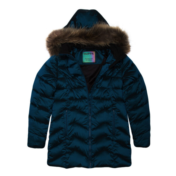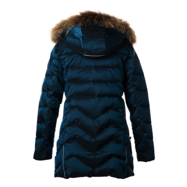 Women’s waterproof and windproof quilted winter coat. Breathable fabric. Soft lining on the inside. Removable snap-on hood. The coat is filled with innovative recycled material imitating the properties of feather fill. The material is warm, dries quickly and does not clump after washing. A great alternative to natural feather fill. Removable natural fur trim on hood. Reflective elements on fabric. Two zippered pockets at front for gloves or other necessities.