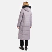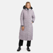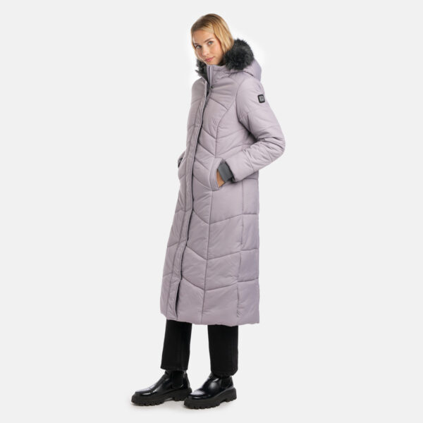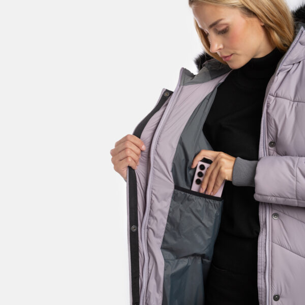 A women’s winter coat that is water-repellent, windproof, and with 300g insulation, designed to keep you warm and protected in cold conditions. The breathable outer fabric is made from recycled fibres, while a soft lining ensures comfort inside the coat. The hood features removable faux fur for versatile styling, and ribbed sleeve cuffs add extra warmth. A two-way front zipper with a snap-button placket provides convenience and coverage. Reflective detailing on the outer fabric enhances visibility in low light.