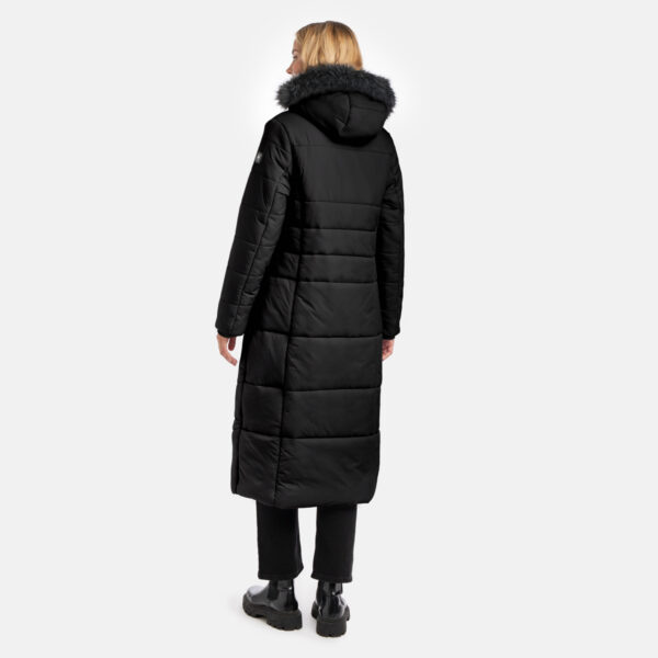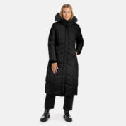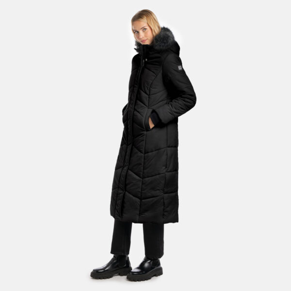 A women’s winter coat that is water-repellent, windproof, and with 300g insulation, designed to keep you warm and protected in cold conditions. The breathable outer fabric is made from recycled fibres, while a soft lining ensures comfort inside the coat. The hood features removable faux fur for versatile styling, and ribbed sleeve cuffs add extra warmth. A two-way front zipper with a snap-button placket provides convenience and coverage. Reflective detailing on the outer fabric enhances visibility in low light.
