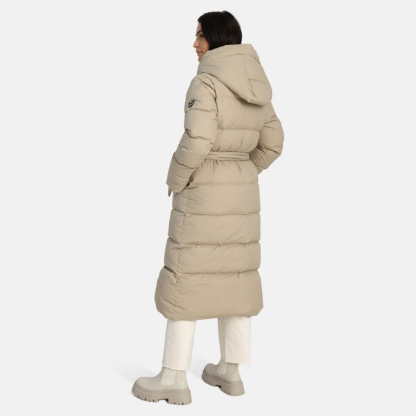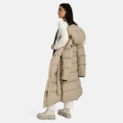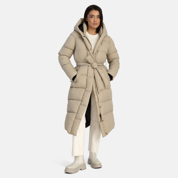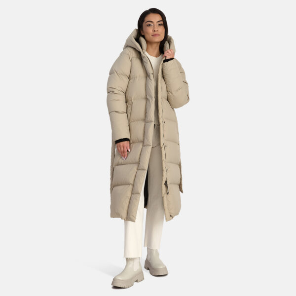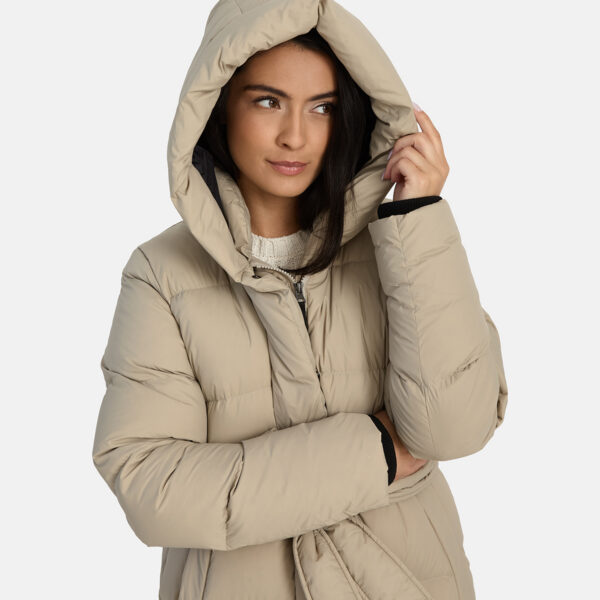 A women’s down coat that is water-repellent, windproof, and built for warmth, comfort, and protection. The breathable outer fabric is made from recycled fibres. Soft lining fabric inside the coat. Filled with feathers and down feathers. Ribbed cuffs on sleeves. Front two-way zipper with a snap button placket. The coat has removable elastic suspenders. Reflective detailing on outer fabric.