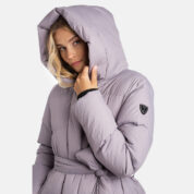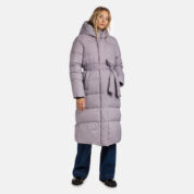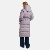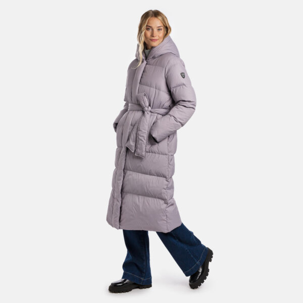A women’s down coat that is water-repellent, windproof, and built for warmth, comfort, and protection. The breathable outer fabric is made from recycled fibres. Soft lining fabric inside the coat. Filled with feathers and down feathers. Ribbed cuffs on sleeves. Front two-way zipper with a snap button placket. The coat has removable elastic suspenders. Reflective detailing on outer fabric.