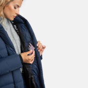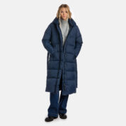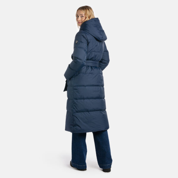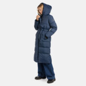 A women’s down coat that is water-repellent, windproof, and built for warmth, comfort, and protection. The breathable outer fabric is made from recycled fibres. Soft lining fabric inside the coat. Filled with feathers and down feathers. Ribbed cuffs on sleeves. Front two-way zipper with a snap button placket. The coat has removable elastic suspenders. Reflective detailing on outer fabric.