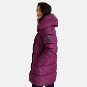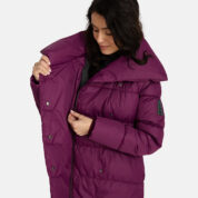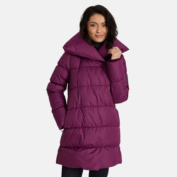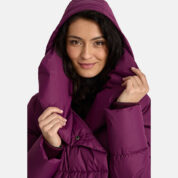 Modern women’s waterproof and windproof down coat Breathable fabric Soft lining on the inside Down feathers and feathers for filling Hood hidden in collar Ribbed cuffs at sleeve ends Two-way zipper covered with stud-press flap at front Side seam pockets Reflective logo on sleeve