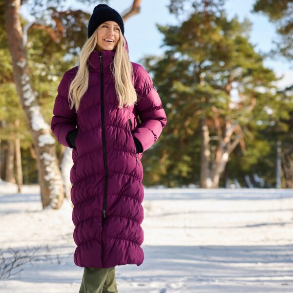 Women´s waterproof and windproof down coat. Breathable outer fabric. Soft lining fabric. Filled with down and feathers. Removable hood attaches to the collar with a zipper. Ribbed cuffs at the sleeve ends. Two-way zipper closure, snap closure at the bottom. Reflective details on the outer fabric.