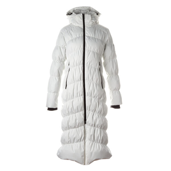 Moteriškas neperšlampamas ir neperpučiamas pūkinis paltas. Orui laidi išorinė medžiaga. Vidinė palto dalis iš minkšto pamušalinio audinio. Užpildas iš pūkų ir plunksnų. Nuimamas gobtuvas prie apykaklės prisegamas kibiu lipduku. Rankovių apačioje tamprus rankogalis. Užsegimas su dviejų krypčių užtrauktuku, apačioje kibus užsegimas. Priekyje įsiūtos kišenės su užtrauktuku. Viršutinis audinys su šviesą atspindinčiomis detalėmis.