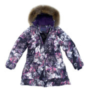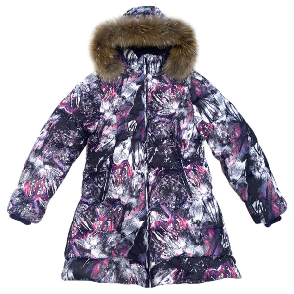 Women’s waterproof and windproof down coat. Breathable fabric. Soft lining on the inside. Down feathers and feathers for filling. Removable snap-on hood. Ribbed cuffs at sleeve ends. With zipper. Integrated zipper pockets at front. Zippered side slits at lower edge. Removable natural fur trim on hood. Reflective elements on fabric.