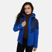 Sieviešu ūdens un vēja necaurlaidīga hibrīdjaka. Jakas kapuce, piedurknes un apakšdaļa ir radīta no mīkstā Softshell auduma. Jakas pildījums ir inovatīvais atkārtoti izmantotais materiāls, kas imitē spalvu pildījumu, jakas audumam piemīt viegls mirdzums. Materiāls ir silts, ātri žūstošs un pēc mazgāšanas nesaveļas. Mīksta jakas odere. Rāvējslēdzēja aizdare. Priekšpusē aizdarāmas kabatas. Jakai ir atstarojošas detaļas.