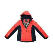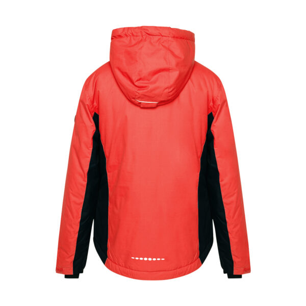 Women’s waterproof and windproof jacket. Breathable fabric. Soft mesh lining on the inside. Powder skirt. Integrated adjustable elastic band around the hood and on the back. Waterproof zipper at front. Integrated zippered pocket at front and on left sleeve. Adjustable sleeve ends. Cuffs with thumb holes at sleeve ends. Waterproof taped seams. Reflective elements on fabric.