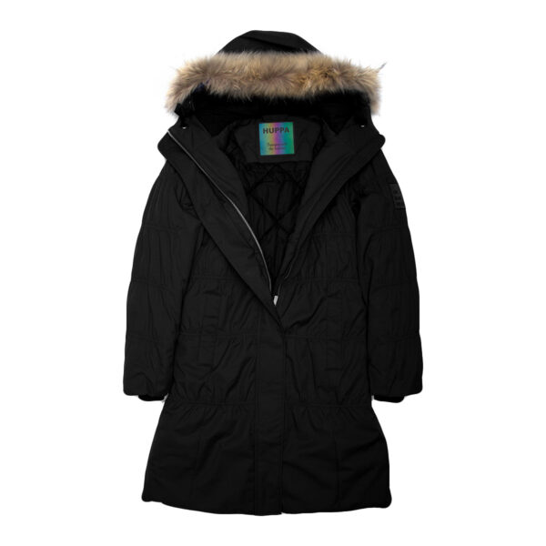 Women´s winter coat made of soft fabric with 200 g insulation. Water- and windproof breathable outer fabric. Soft lining fabric. Adjustable hood. Ribbed cuffs at the sleeve ends. Two-way zipper covered with a flap at the front. Magnetic pockets and front flap. Natural fur trim on the hood. Reflective detail on the sleeve.