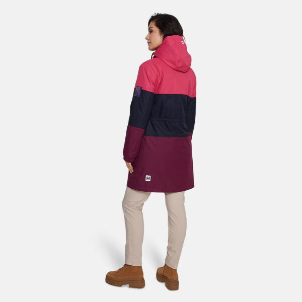 Insulated (40 g) water- and windproof parka for women, suitable for spring and autumn. The top layer of the parka is made of a breathable material. It has a soft lining and a drawstring for the hood. The parka has elasticated sleeve cuffs and an adjustable waist with stoppers. It has waterproof, taped seams and is decorated with reflective details.