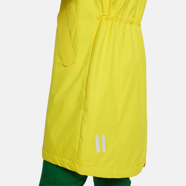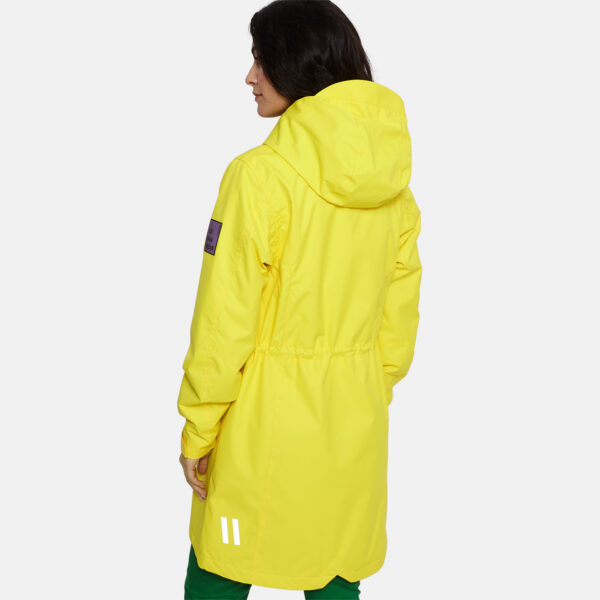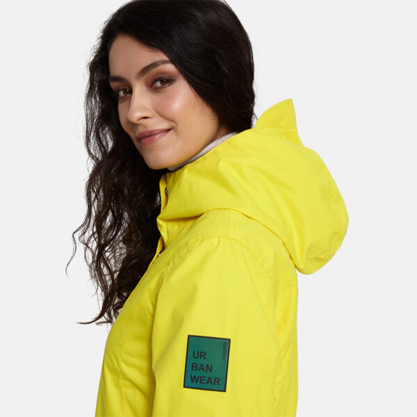 Women’s waterproof and windproof spring and autumn parka. Breathable fabric. Soft lining on the inside. Adjustable hood and sleeve ends. Drawstring tunnel with stoppers on waist. Waterproof taped seams. Reflective elements on fabric.