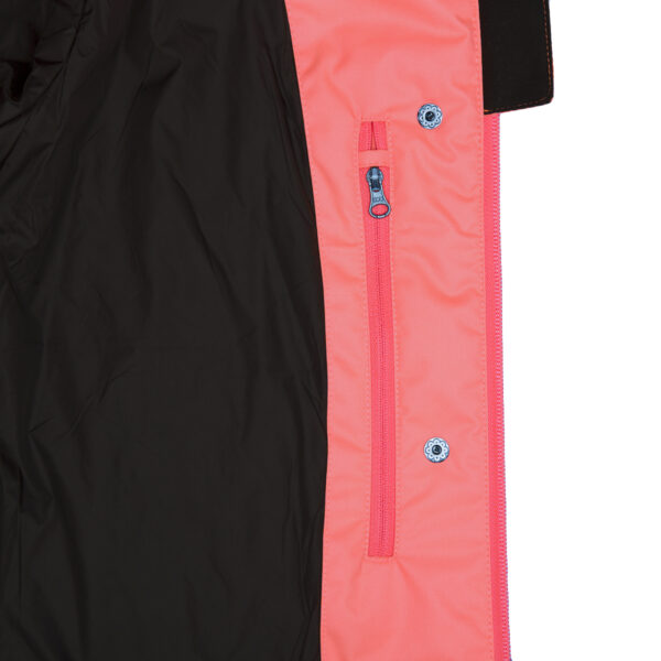 Bērnu ūdens un vēja necaurlaidīga jaka. Gaisu caurlaidīgs virsējais audums. Mīksta jakas odere. Noņemamā kapuce pie apkakles stiprināma ar velkro aizdari. Piedurknēs un kapucē iestrādāta gumijas apdare. Priekšpusē apšūta rāvējslēdzēja aizdare. Priekšpusē kabatas. Auduma virspusē atstarojošas detaļas.
