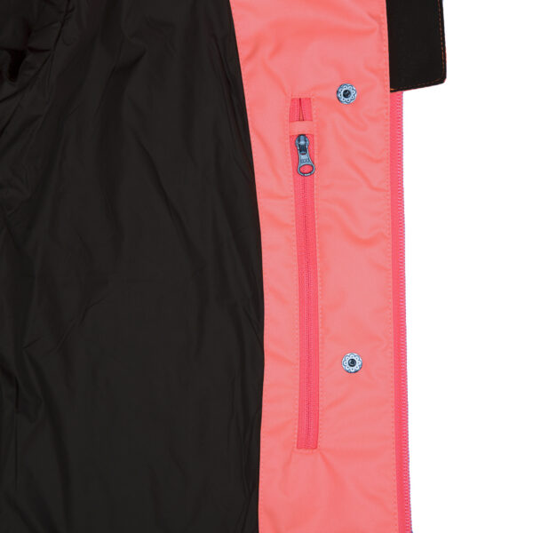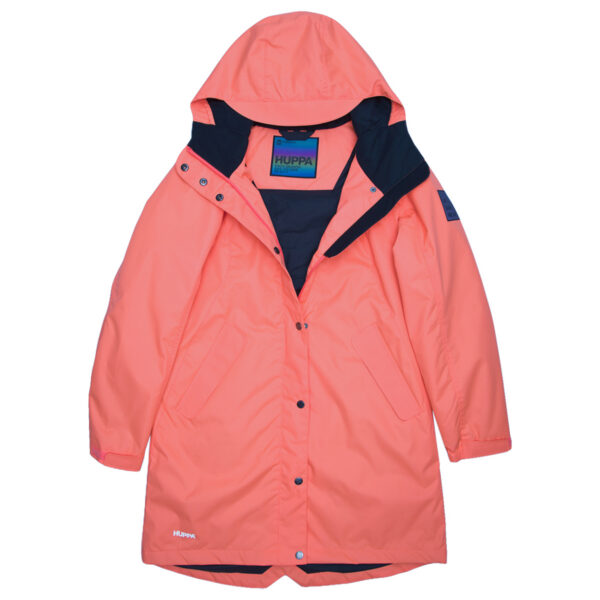 Women’s waterproof and windproof spring and autumn parka. Breathable fabric. Soft lining on the inside. Adjustable hood and sleeve ends. Drawstring tunnel with stoppers on waist. Waterproof taped seams. Reflective elements on fabric.