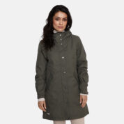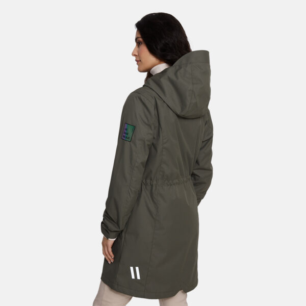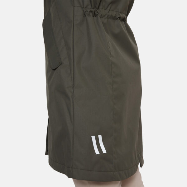 Women’s waterproof and windproof spring and autumn parka. Breathable fabric. Soft lining on the inside. Adjustable hood and sleeve ends. Drawstring tunnel with stoppers on waist. Waterproof taped seams. Reflective elements on fabric.