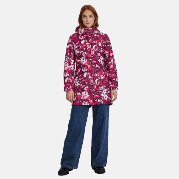 Women’s waterproof and windproof spring and autumn parka. Breathable fabric. Soft lining on the inside. Adjustable hood and sleeve ends. Drawstring tunnel with stoppers on waist. Waterproof taped seams. Reflective elements on fabric.