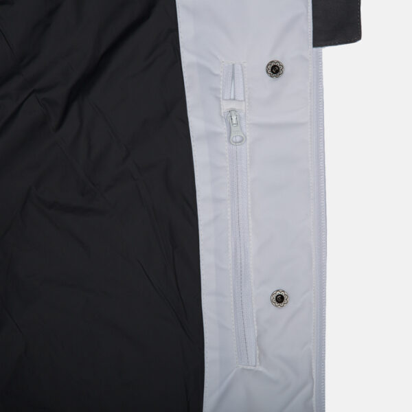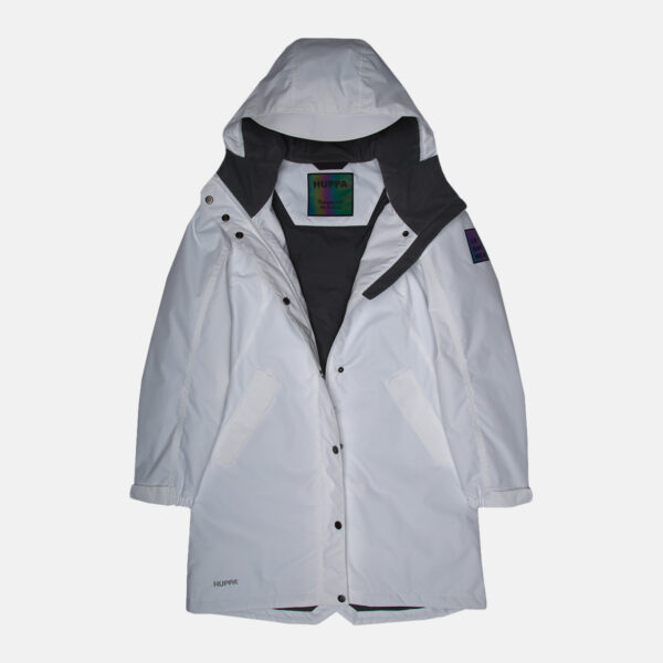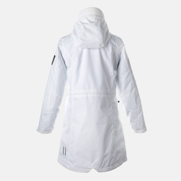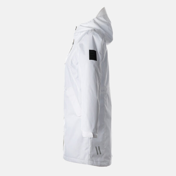 Women’s waterproof and windproof spring and autumn parka. Breathable fabric. Soft lining on the inside. Adjustable hood and sleeve ends. Drawstring tunnel with stoppers on waist. Waterproof taped seams. Reflective elements on fabric.