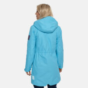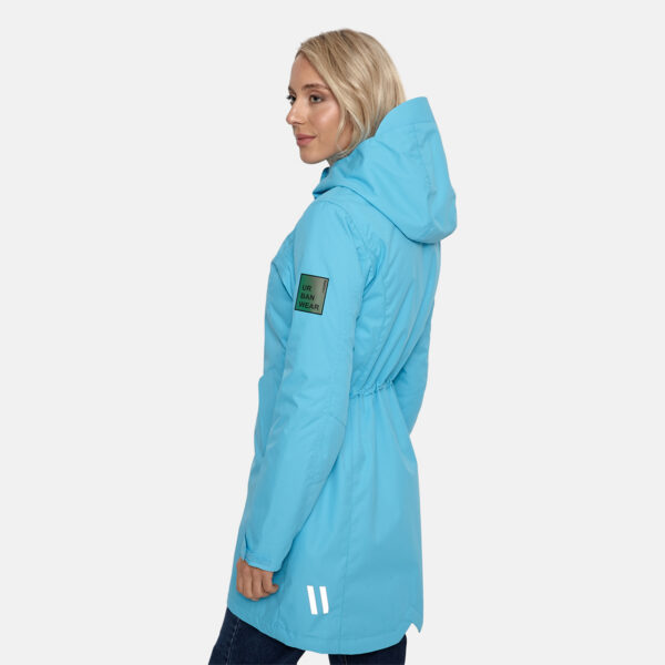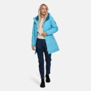 Women’s waterproof and windproof spring and autumn parka. Breathable fabric. Soft lining on the inside. Adjustable hood and sleeve ends. Drawstring tunnel with stoppers on waist. Waterproof taped seams. Reflective elements on fabric.