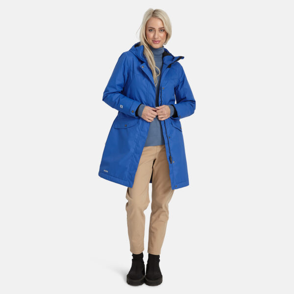 Insulated (100 g) water- and windproof between-seasons parka for women. The top layer of the parka is made of a breathable material. It is has soft lining, an adjustable hood and sleeve cuffs, as well as an adjustable waist with stoppers. It has waterproof, taped seams and is decorated with reflective details.