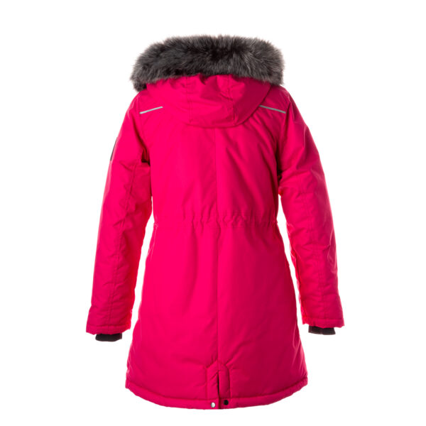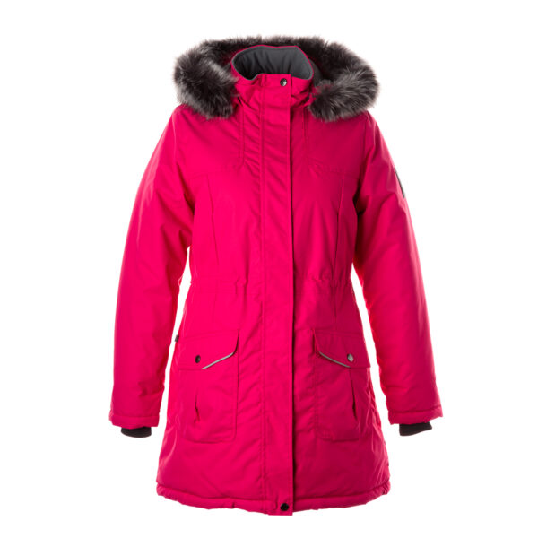 Moteriška neperšlampama ir neperpučiama žieminė parka. Orui laidi išorinė medžiaga. Vidinė parkos dalis iš minkšto pamušalinio audinio. Nuimamas gobtuvas prie apykaklės prisegamas kibiu lipduku. Rankovių apačioje tamprus rankogalis. Juosmenyje įsiūta guminė juostelė su fiksatoriais. Vandeniui atsparios klijuotos siūlės. Gobtuvas apsiūtas dirbiniu kailiu. Viršutinis audinys su šviesą atspindinčiomis detalėmis.