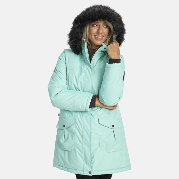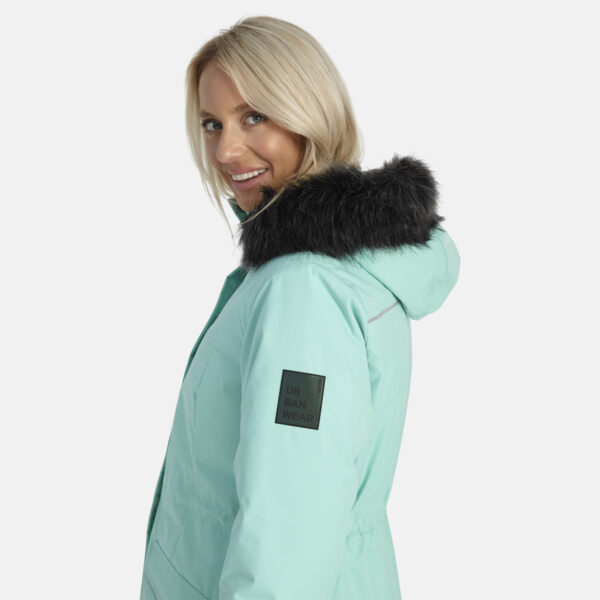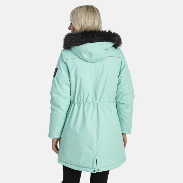 Moteriška neperšlampama ir neperpučiama žieminė parka. Orui laidi išorinė medžiaga. Vidinė parkos dalis iš minkšto pamušalinio audinio. Nuimamas gobtuvas prie apykaklės prisegamas kibiu lipduku. Rankovių apačioje tamprus rankogalis. Juosmenyje įsiūta guminė juostelė su fiksatoriais. Vandeniui atsparios klijuotos siūlės. Gobtuvas apsiūtas dirbiniu kailiu. Viršutinis audinys su šviesą atspindinčiomis detalėmis.