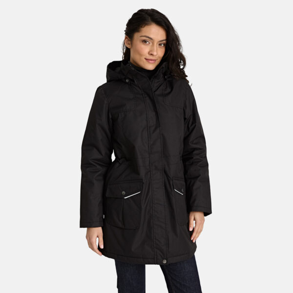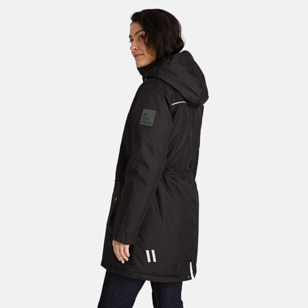 Women’s waterproof and windproof between-seasons parka. Breathable fabric. Soft lining on the inside. Removable snap-on hood. Ribbed cuffs at sleeve ends. Drawstring tunnel with stoppers on waist. Waterproof taped seams. Reflective elements on fabric.