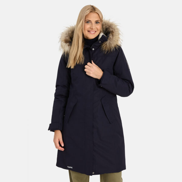 Women’s water- and windproof winter parka with 200 g insulation. Breathable outer fabric. Soft fabric on the inside of the parka. Sheepskin imitation lining at the upper back and inside of the hood. Adjustable hood. Ribbed cuffs on sleeves. Adjustable sleeve cuffs. Front two-way zipper with a snap button placket. Rubber cord tunnel with stoppers on the waistband. Waterproof taped seams. Detachable natural fur trim on hood. Reflective detailing on outer fabric.