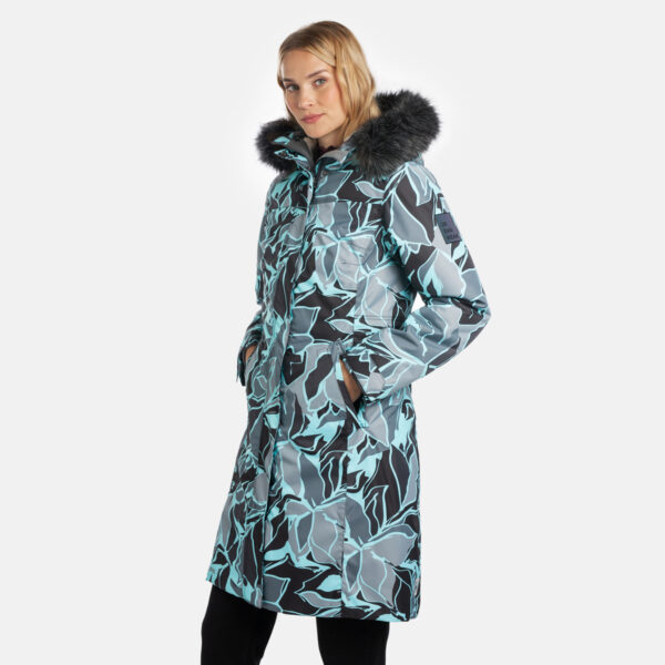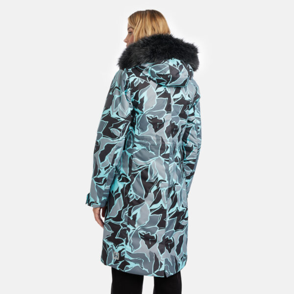 Women’s water- and windproof winter parka with 200 g insulation. Breathable outer fabric. Soft fabric on the inside of the parka. Sheepskin imitation lining at the upper back and inside of the hood. Adjustable hood. Ribbed cuffs on sleeves. Adjustable sleeve cuffs. Front two-way zipper with a snap button placket. Rubber cord tunnel with stoppers on the waistband. Waterproof taped seams. Detachable faux fur trim on hood. Reflective detailing on outer fabric.