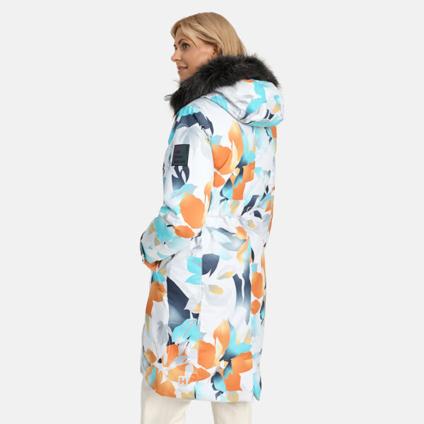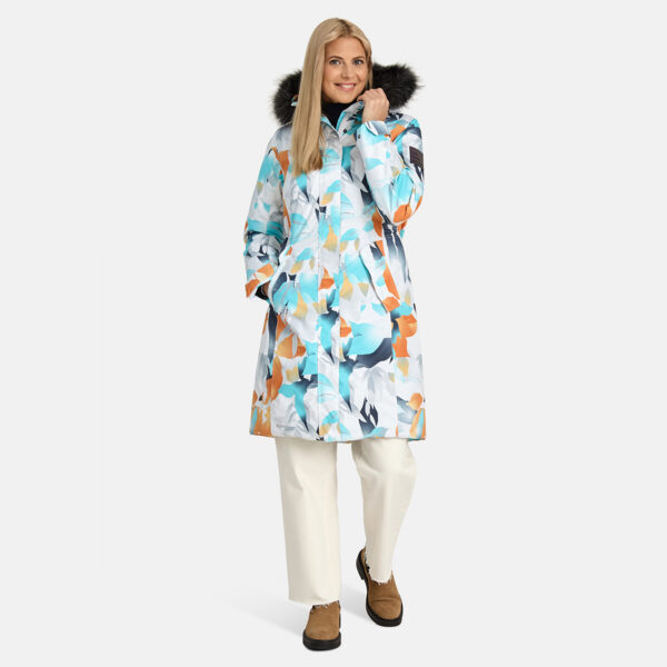 Women’s water- and windproof winter parka with 200 g insulation. Breathable outer fabric. Soft fabric on the inside of the parka. Sheepskin imitation lining at the upper back and inside of the hood. Adjustable hood. Ribbed cuffs on sleeves. Adjustable sleeve cuffs. Front two-way zipper with a snap button placket. Rubber cord tunnel with stoppers on the waistband. Waterproof taped seams. Detachable faux fur trim on hood. Reflective detailing on outer fabric.