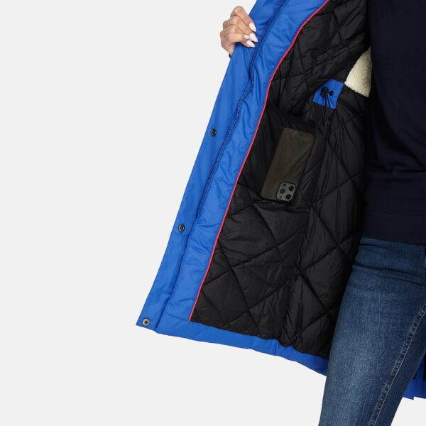 Sieviešu ūdens un vēja necaurlaidīga ziemas parka ar 200 g siltinājumu. Gaisu caurlaidīgs virsējais audums. Jakas odere no mīksta auduma. Muguras augšdaļā un kapuces iekšējos sānos jērādas imitācijas odere. Regulējama kapuce. Rievotas piedurknes. Regulējamas piedurknes. Priekšpusē apšūts divvirziena rāvējslēdzējs. Jostas vietā aizdare ar stoperi. Ūdens necaurlaidīgi līmēti izšuvumi. Kapucei noņemama mākslīgās kažokādas mala. Auduma virspusē atstarojošas detaļas.