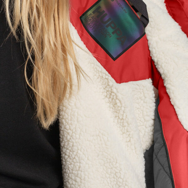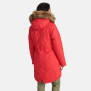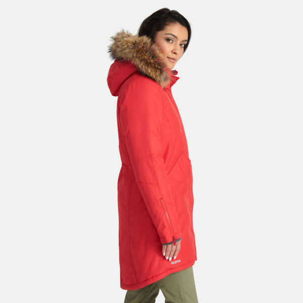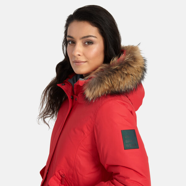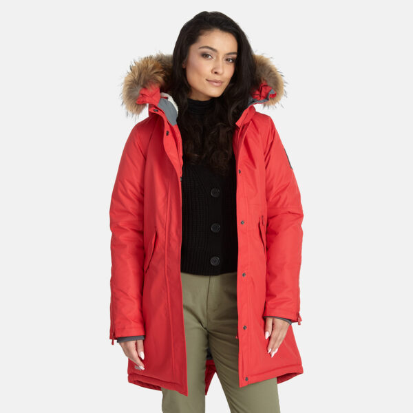 Women’s waterproof and windproof winter parka. Breathable fabric. Soft fabric on the inside. Faux sheepskin lining at the top of the back and inside the hood. Adjustable hood. Ribbed cuffs at sleeve ends. Lapped two-way zipper at front. Magnetic fastening on flap pockets. Drawstring tunnel with stoppers on waist for adjusting the waist from the inside. Waterproof taped seams. Removable natural fur trim on hood. Reflective elements on fabric.