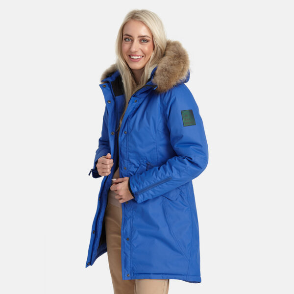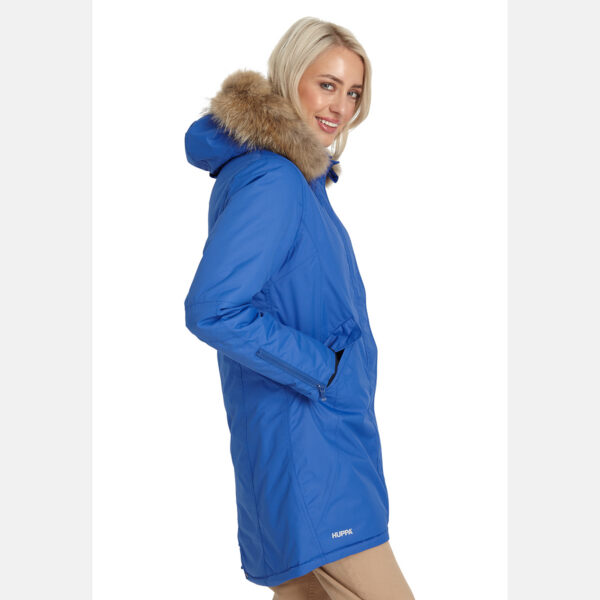Women’s waterproof and windproof winter parka. Breathable fabric. Soft fabric on the inside. Faux sheepskin lining at the top of the back and inside the hood. Adjustable hood. Ribbed cuffs at sleeve ends. Lapped two-way zipper at front. Magnetic fastening on flap pockets. Drawstring tunnel with stoppers on waist for adjusting the waist from the inside. Waterproof taped seams. Removable natural fur trim on hood. Reflective elements on fabric.