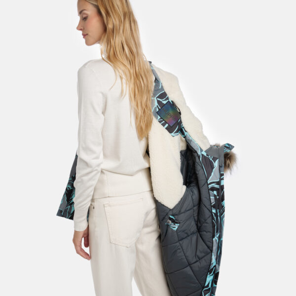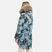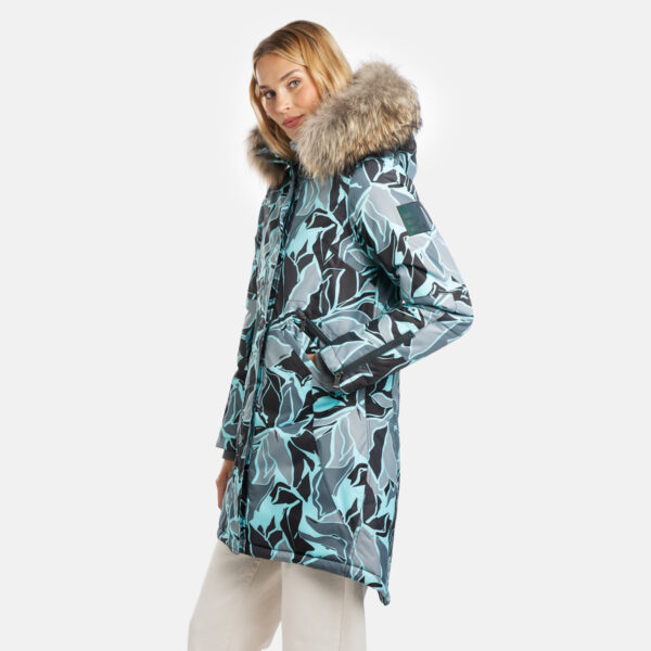 Women’s waterproof and windproof winter parka. Breathable fabric. Soft fabric on the inside. Faux sheepskin lining at the top of the back and inside the hood. Adjustable hood. Ribbed cuffs at sleeve ends. Lapped two-way zipper at front. Magnetic fastening on flap pockets. Drawstring tunnel with stoppers on waist for adjusting the waist from the inside. Waterproof taped seams. Removable natural fur trim on hood. Reflective elements on fabric.