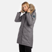 Women’s waterproof and windproof winter parka. Breathable fabric. Soft fabric on the inside. Faux sheepskin lining at the top of the back and inside the hood. Adjustable hood. Ribbed cuffs at sleeve ends. Lapped two-way zipper at front. Magnetic fastening on flap pockets. Drawstring tunnel with stoppers on waist for adjusting the waist from the inside. Waterproof taped seams. Removable natural fur trim on hood. Reflective elements on fabric.