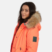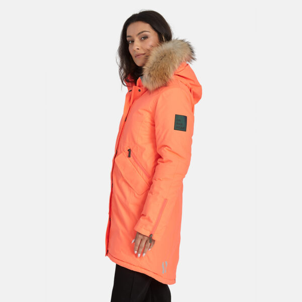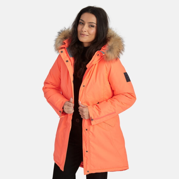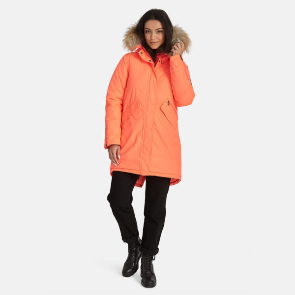 Women’s waterproof and windproof winter parka. Breathable fabric. Soft fabric on the inside. Faux sheepskin lining at the top of the back and inside the hood. Adjustable hood. Ribbed cuffs at sleeve ends. Lapped two-way zipper at front. Magnetic fastening on flap pockets. Drawstring tunnel with stoppers on waist for adjusting the waist from the inside. Waterproof taped seams. Removable natural fur trim on hood. Reflective elements on fabric.