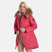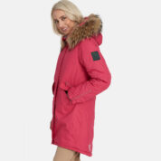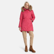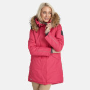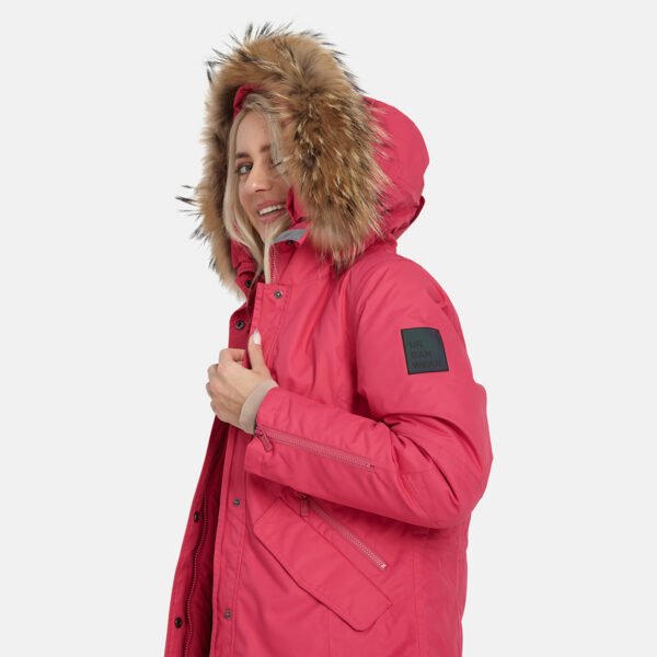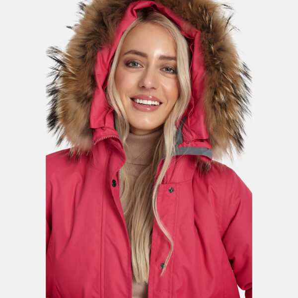 Women’s waterproof and windproof winter parka. Breathable fabric. Soft fabric on the inside. Faux sheepskin lining at the top of the back and inside the hood. Adjustable hood. Ribbed cuffs at sleeve ends. Lapped two-way zipper at front. Magnetic fastening on flap pockets. Drawstring tunnel with stoppers on waist for adjusting the waist from the inside. Waterproof taped seams. Removable natural fur trim on hood. Reflective elements on fabric.