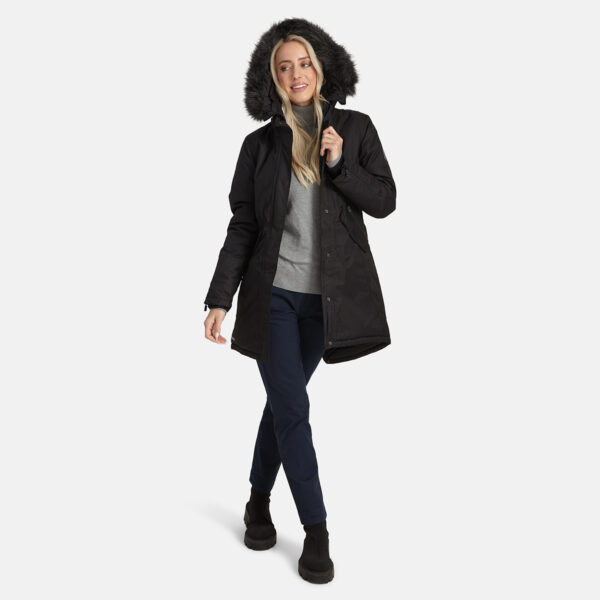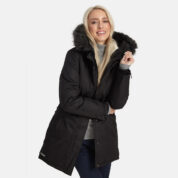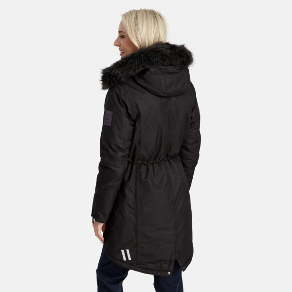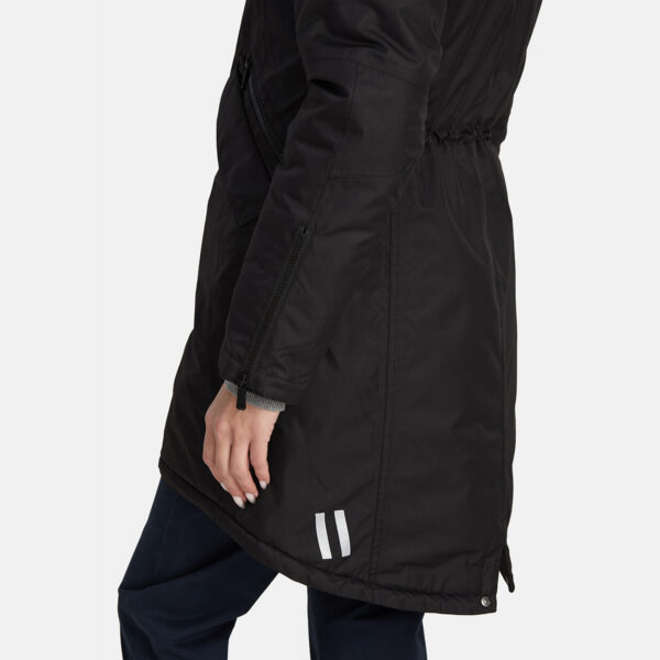 Women’s waterproof and windproof winter parka. Breathable fabric. Soft fabric on the inside. Faux sheepskin lining at the top of the back and inside the hood. Adjustable hood. Ribbed cuffs at sleeve ends. Lapped two-way zipper at front. Magnetic fastening on flap pockets. Drawstring tunnel with stoppers on waist for adjusting the waist from the inside. Waterproof taped seams. Removable faux fur trim on hood. Reflective elements on fabric.