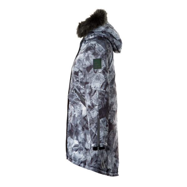 Women’s waterproof and windproof winter parka. Breathable fabric. Soft fabric on the inside. Faux sheepskin lining at the top of the back and inside the hood. Adjustable hood. Ribbed cuffs at sleeve ends. Two-way zipper covered with stud-press flap at front. Magnetic fastening on flap pockets. Drawstring tunnel with stoppers on waist. Waterproof taped seams. Removable faux fur trim on hood. Reflective elements on fabric.