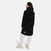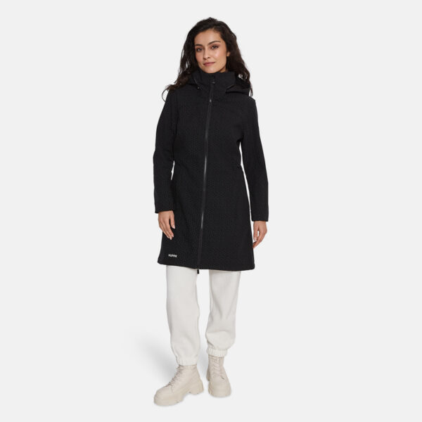 Women’s windproof Softshell coat. Dotted reflective print all over. Brushed soft on the inside. Hood can be stowed away inside stand-up collar. Integrated zippered pockets. Drawstring tunnel with stoppers on waist.
