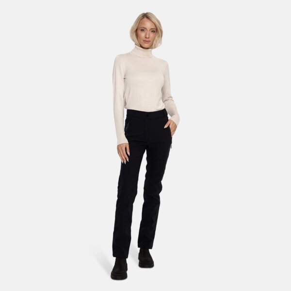 Women’s windproof Softshell pants. Brushed soft on the inside. Buttonhole-adjustable waist. Integrated zippered pockets. Reflective logo on lower leg.