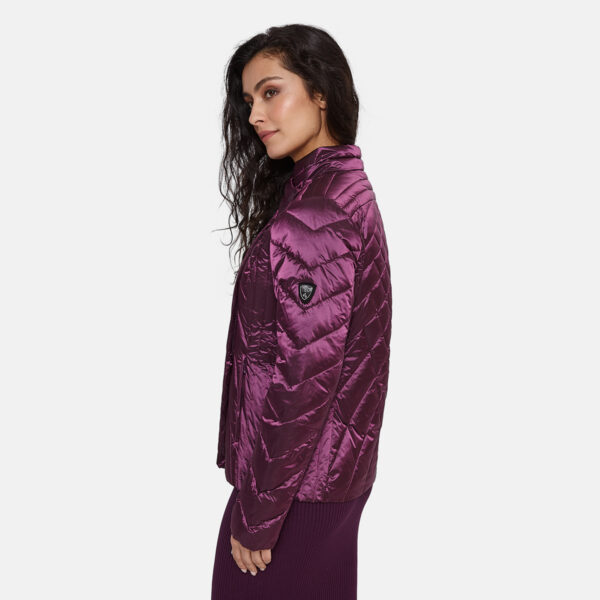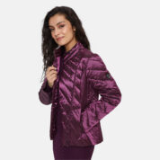 Quilted women’s jacket. Windproof slightly glossy top fabric. The jacket is filled with innovative recycled material imitating the properties of feather fill. The material is warm, dries quickly and does not clump after washing. A great alternative to natural feather fill.