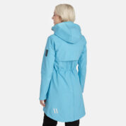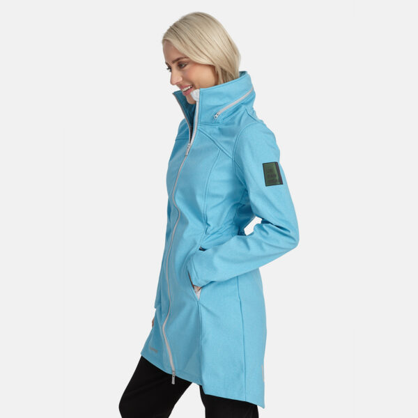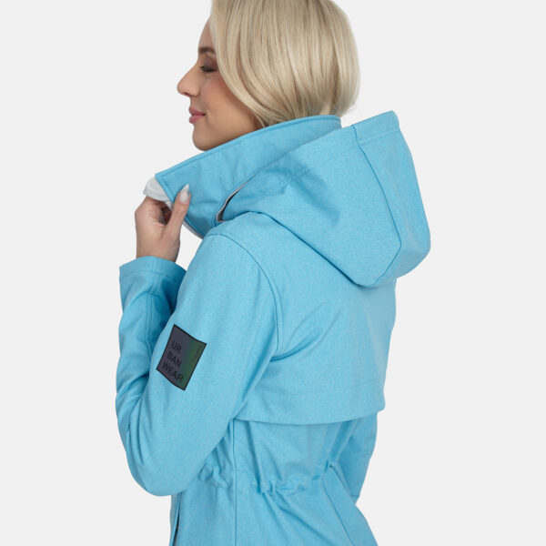 Women’s windproof Softshell coat. Dotted reflective print all over. Brushed soft on the inside. Hood can be stowed away inside stand-up collar. Integrated zippered pockets. Drawstring tunnel with stoppers on waist.