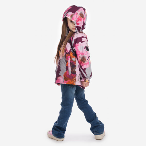 Lasten veden- ja tuulenpitävä kevät-syystakki 80 g vanutäytteellä. Hengittävä päällikangas. Hupun reunassa on kuminauha. Irrotettava huppu kiinnittyy kaulukseen neppareilla. Helmassa on stopperillinen kuminauha. Vetoketjulliset taskut. Päällikankaassa on heijastavia yksityiskohtia.