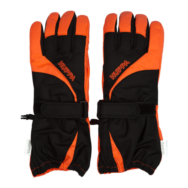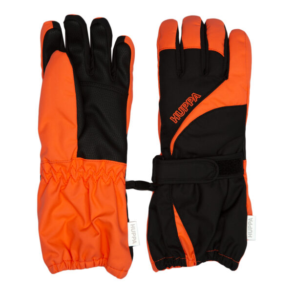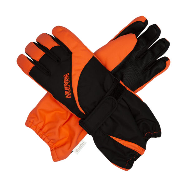 Lasten veden- ja tuulenpitävät vuoratut käsineet. Hengittävä ulkokangas. Mukava integroitu kuminauha ranteessa. Säädettävä ranneosa tarranauhalla. Käsineiden sisäpuoli on valmistettu pehmeästä fleecekankaasta. Pieni klipsi auttaa pitämään hanskat yhdessä. Ulkokankaassa heijastava Huppa-logo.