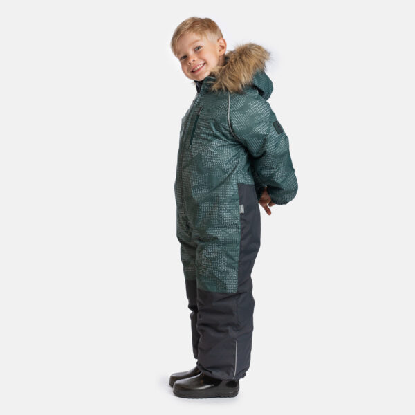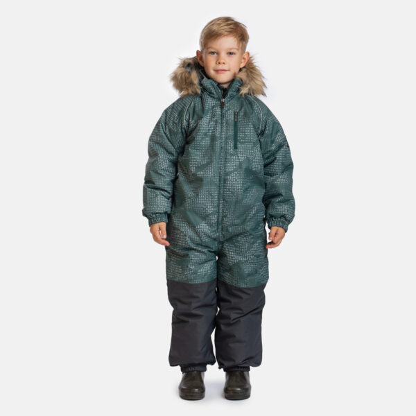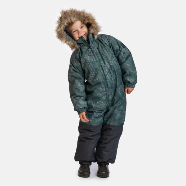 Lasten veden- ja tuulenpitävä talvihaalari, jossa 200 g:n eristys. Hengittävä ulkokangas. Haalarin sisäpuoli pehmeää kangasta. Hihan- ja lahkeensuissa sekä hupun reunassa sisäänommeltu kuminauha. Irrotettava huppu kiinnittyy kaulukseen neppareilla. Vyötäröön ommeltu napinlävillä varustettu kuminauha. Vedenpitävät teipatut saumat. Tuotteessa mukana joustavat jalkalenkit. Ulkokankaassa heijastavia yksityiskohtia.
