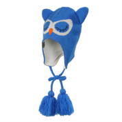 Taaperoiden suloinen pöllöhattu sisäänkudotuilla kuvioilla. Käyttömukavuutta lisäävät ihoystävällinen puuvillainen trikoovuori pipon sisäpuolella ja tupsuilla varustetut kiinnitysnauhat. Pipoa koristelevat hauskat silmälasit edessä ja korvat päälaella.