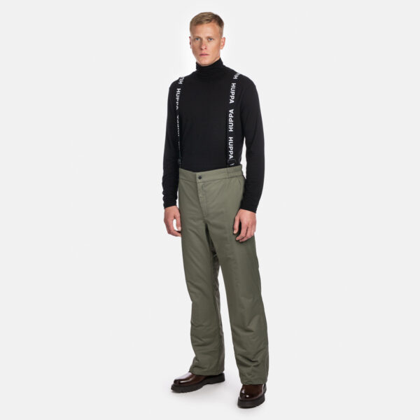 Miesten veden- ja tuulenpitävät housut. Hengittävä ulkokangas. Housujen sisäpuoli on valmistettu pehmeästä vuorikankaasta. Säädettävät irrotettavat olkaimet. Takana sisäänrakennettu vetoketjutasku. Jalkojen päissä lumilukot. Kuminauhatunneli, jossa tulpat jalkojen päissä. Vedenpitävät teipatut saumat. Heijastavat yksityiskohdat housujen alaosassa.