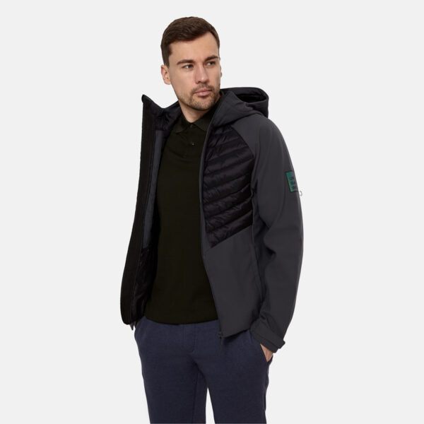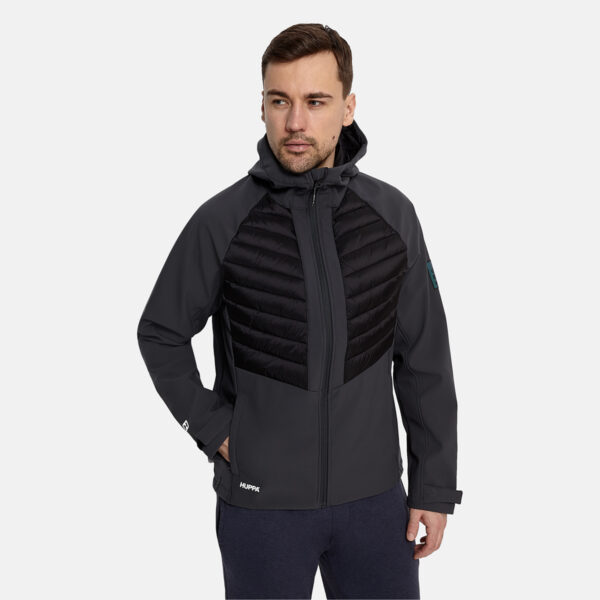Meesten veden- ja tuulenpitävä hybriditakki. Takin huppu, hihat ja alaosa on valmistettu pehmeästä Softshell-kankaasta. Kevyesti kiiltävä tikattu toppi on täytetty innovatiivisella kierrätysmateriaalilla, joka jäljittelee höyhentäytteen ominaisuuksia. Materiaali on lämmin, kuivuu nopeasti eikä tartu pyykkiin. Takissa on pehmeä sisäpuoli. Hihanpäät ovat säädettävät. Vetoketjukiinnitys. Edessä integroidut vetoketjutaskut. Takissa heijastavat yksityiskohdat.