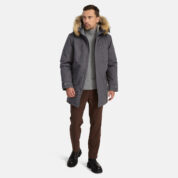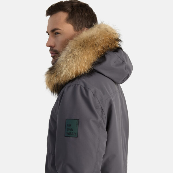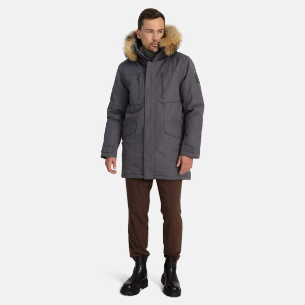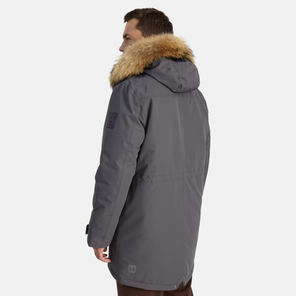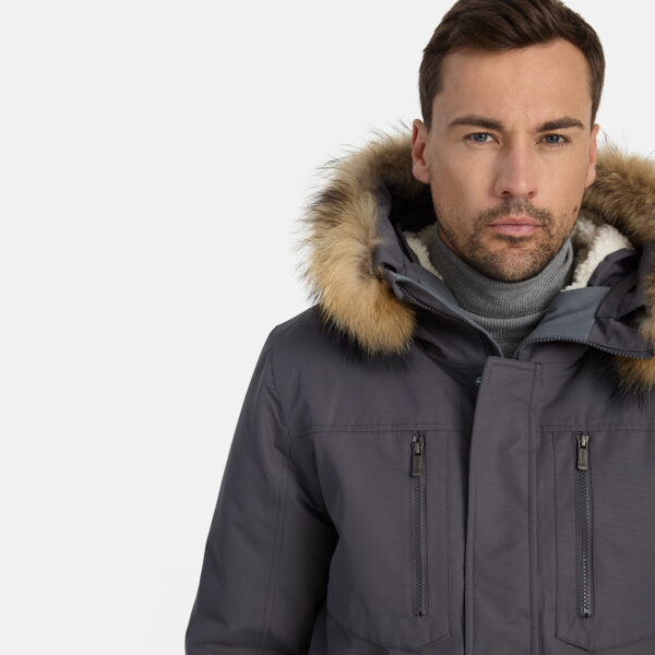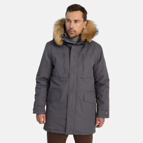 Miesten veden- ja tuulenpitävä talviparka 200 g eristyksellä. Hengittävä ulkokangas. Parkan sisäpuoli on pehmeää kangasta. Lampaannahkajäljitelmävuori yläselässä ja hupun sisäpuolella. Säädettävä huppu. Resorit hihansuissa. Hihanpäät ovat säädettävät. Kaksisuuntainen vetoketju, joka on peitetty painintangolla edessä suljettaessa. Kuminauhatunneli vyötäröllä. Vedenpitävät teipatut saumat. Hupussa irrotettava luonnonturkisreunus. Ulkokankaassa heijastavat yksityiskohdat.