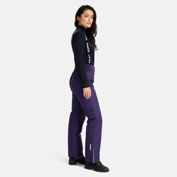 Naisten veden- ja tuulenpitävät housut. Hengittävä ulkokangas. Housujen sisäpuoli on valmistettu pehmeästä vuorikankaasta. Säädettävät irrotettavat olkaimet. Takana sisäänrakennettu vetoketjutasku. Jalkojen päissä lumilukot. Kuminauhatunneli, jossa tulpat jalkojen päissä. Vedenpitävät teipatut saumat. Heijastavat yksityiskohdat housujen alaosassa.
