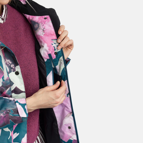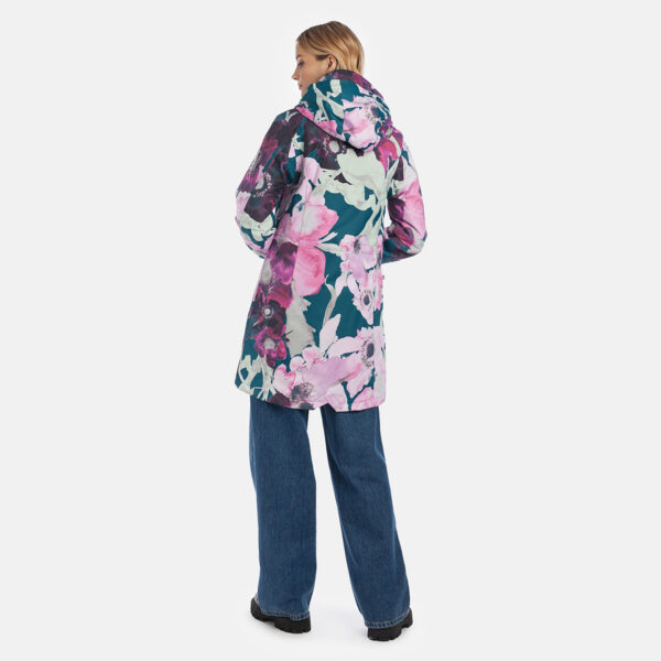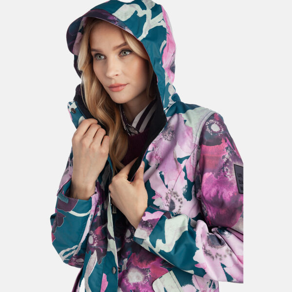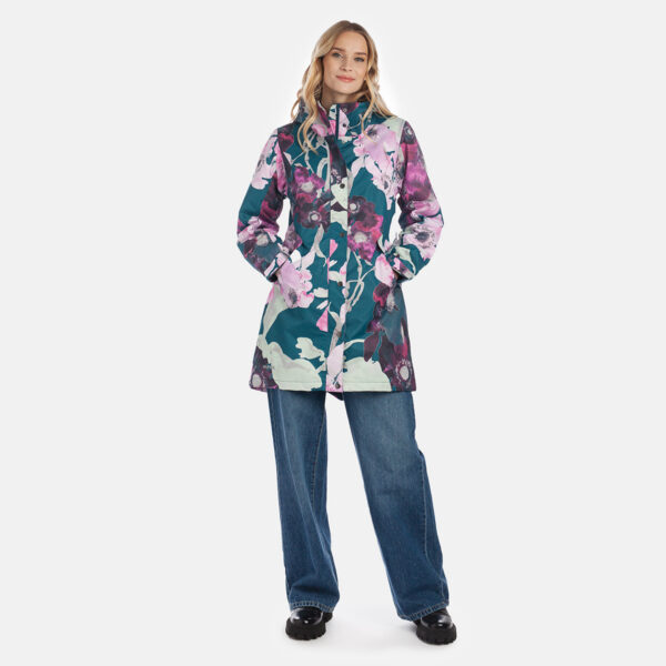 Naisten veden- ja tuulenpitävä parkatakki kevät- ja syyskaudelle 40 g toppauksella. Hengittävä ulkokangas. Parkan sisäpuoli on valmistettu pehmeästä vuorikankaasta. Säädettävä huppu ja hihansuut. Vyötäröllä säädettävä kiristysnauha. Vedenpitävät, teipatut saumat. Ulkokankaassa heijastavat yksityiskohdat.